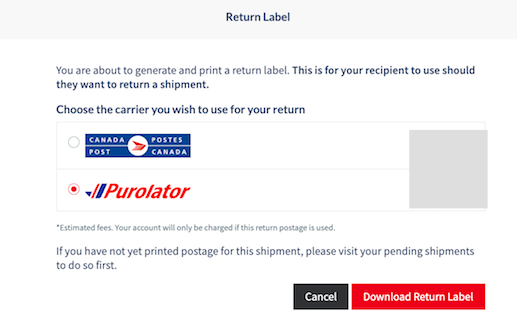 Typically, you will be presented with two return options (Purolator or Canada Post), with the associated cost displayed next to each choice.
