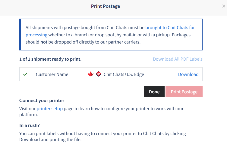 Chit Chats postage is optimized for printing on 4 x 6” thermal labels however, a larger printing area will work as well. You have the option to download a PDF version of the label in both 4 x 6” and 8.5 x 11” formats to suit your needs.