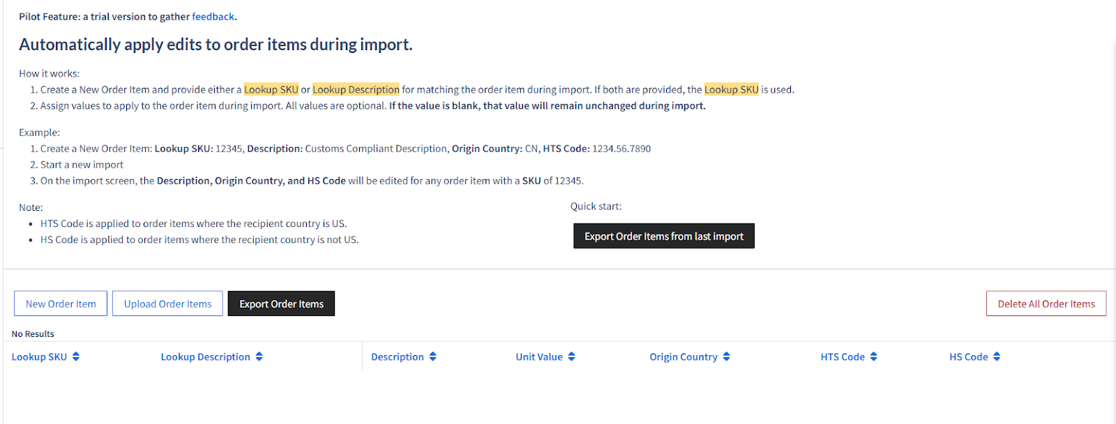 You can activate Import Automation in your Settings > Shipping section. Navigate to Order Item Automation. This feature will allow you to associate SKU numbers or product descriptions with a customs-compliant description, HTS code, COO, and more.