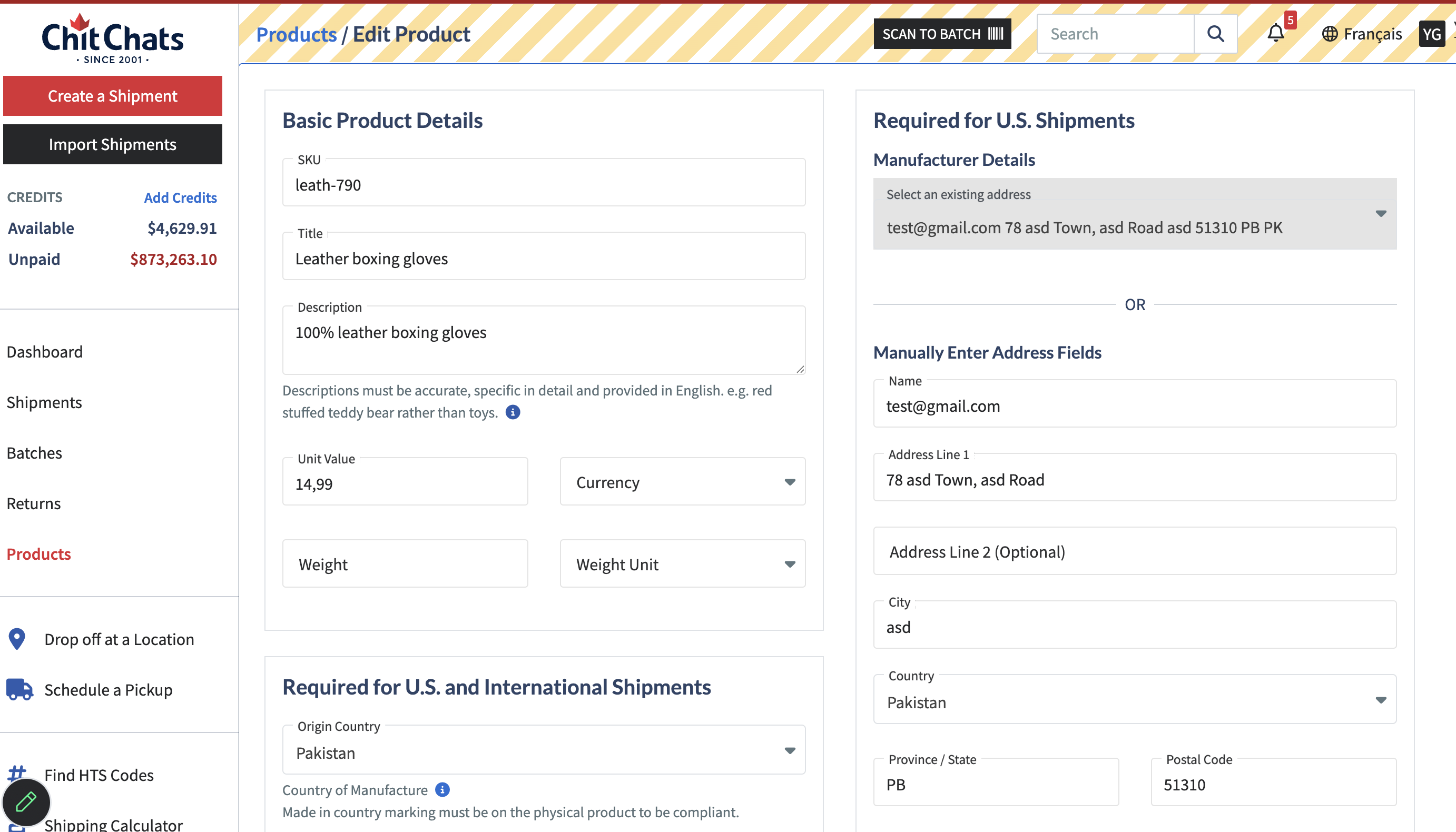 When manually creating shipments, you may be prompted to select from a list of products you’ve already created. This feature is great for those who import to the Chit Chats platform as it will automatically update your products from connected stores to customs-compliant versions! Creating products helps you save time by eliminating the need to re-enter product details.
