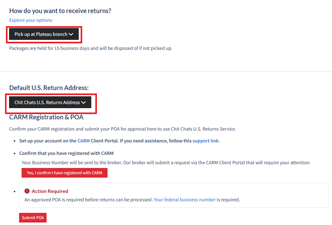 After confirming your CARM registration, you must immediately begin the POA (Power of Attorney) process. This authorizes our customs broker to manage your returns account on your behalf.
