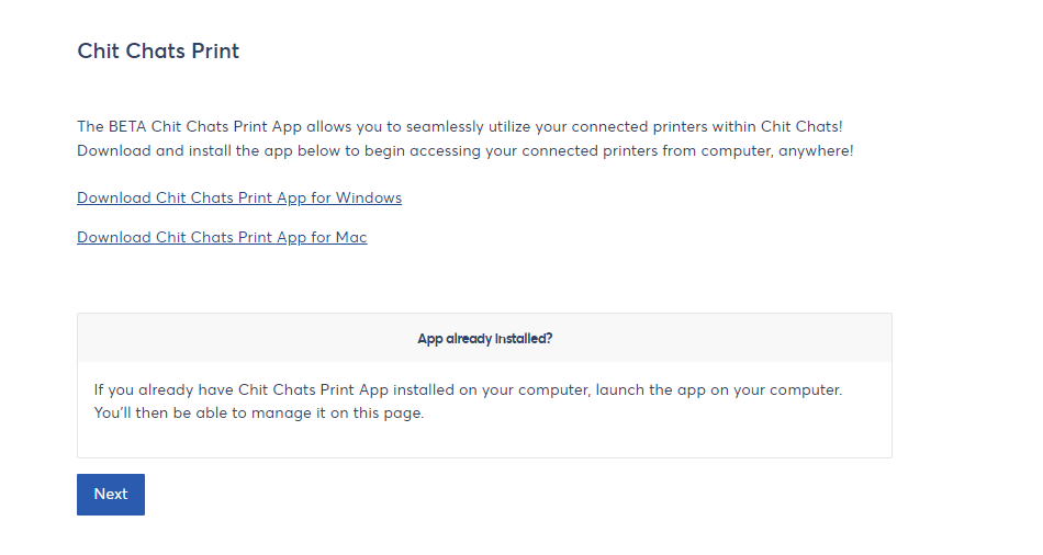 Dans la section "Application d'impression" sur le côté droit, sélectionnez "Application d'impression Chit Chats", puis le lien "configuration de l'imprimante”