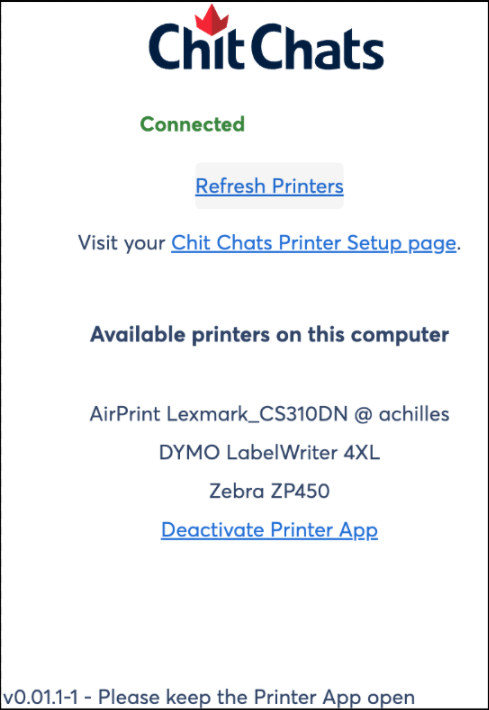 Lorsque vous vous préparez à imprimer des étiquettes à partir de votre imprimante ZPL, nous vous recommandons d'installer d'abord Java 8 ou une version plus récente sur votre ordinateur. Par la suite, vous devez télécharger l'Application d'Impression Chit Chats; toutefois, vous avez l'option d'utiliser QZ Tray. Ces plugiciels d'imprimante sont utilisés sur la plateforme Chit Chats pour imprimer les frais d'affranchissement.. Pour plus d'informations su QZ tray, consultez la configuration minimale requise pour QZ.