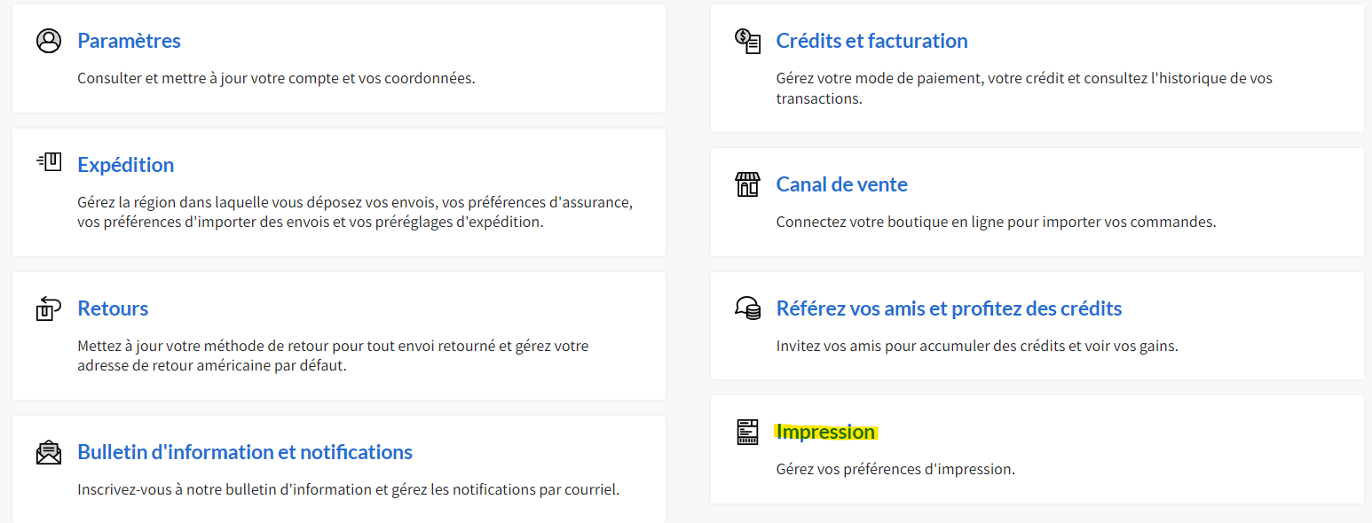 Allez dans vos paramètres d'expédition. Paramètres (barre latérale gauche) > Impression.