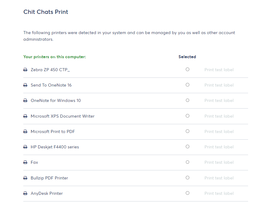 2.Sélectionnez votre imprimante ZPL dans la liste des imprimantes connectées disponibles sur chitchats.com/printer.