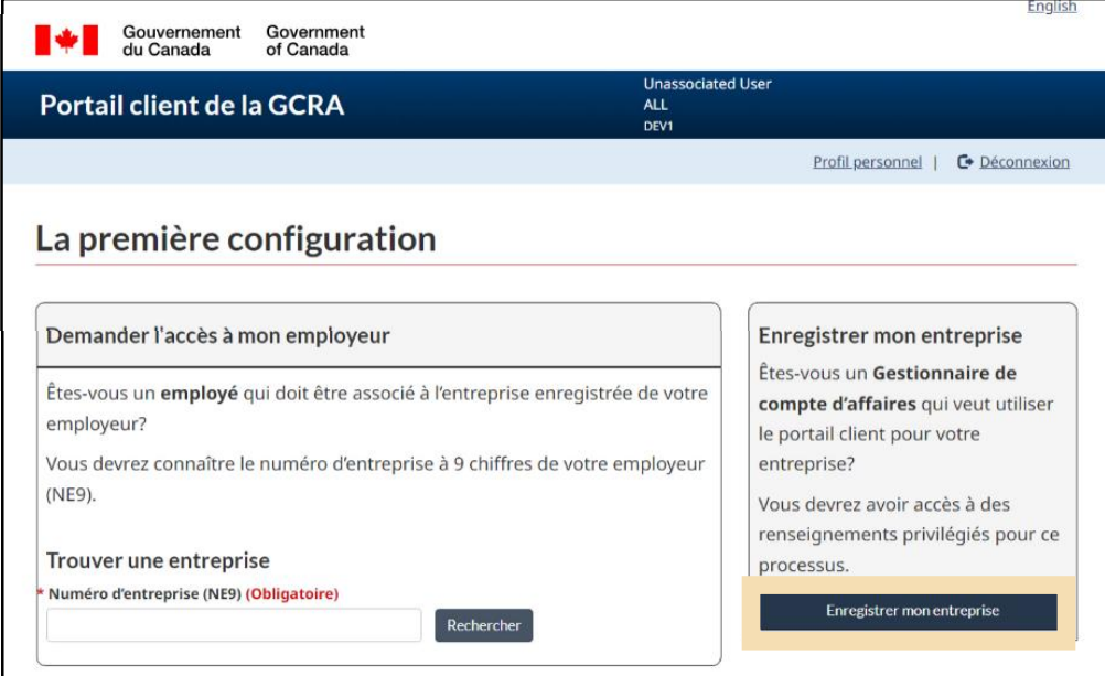 Remarque : Si vous êtes une entreprise individuelle ou une société de personnes et que vous n’avez pas besoin de vous inscrire à d’autres comptes de programme de l’ARC, vous pouvez demander un NE via le Portail client de la GCRA.