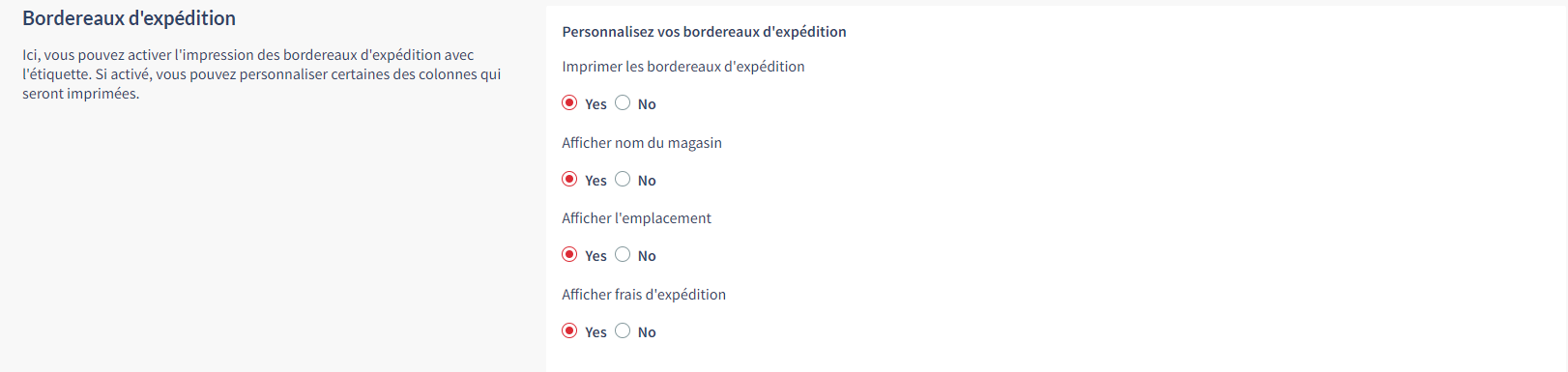 Ici, vous pouvez activer ou désactiver les bordereaux d'expédition et choisir quelles colonnes facultatives vous souhaitez inclure. Une fois les bordereaux d'expédition activés, un bordereau sera imprimé chaque fois que vous imprimerez une étiquette d'expédition à l'aide d'une imprimante d'étiquettes.
