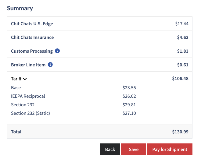 Pour le moment, tous les tarifs et droits de douane sont affichés sous la forme de « frais tarifaires » généraux sur la plateforme Chit Chats, tandis que les frais de courtage sont indiqués séparément. Pour en savoir plus sur les frais, veuillez consulter ici.