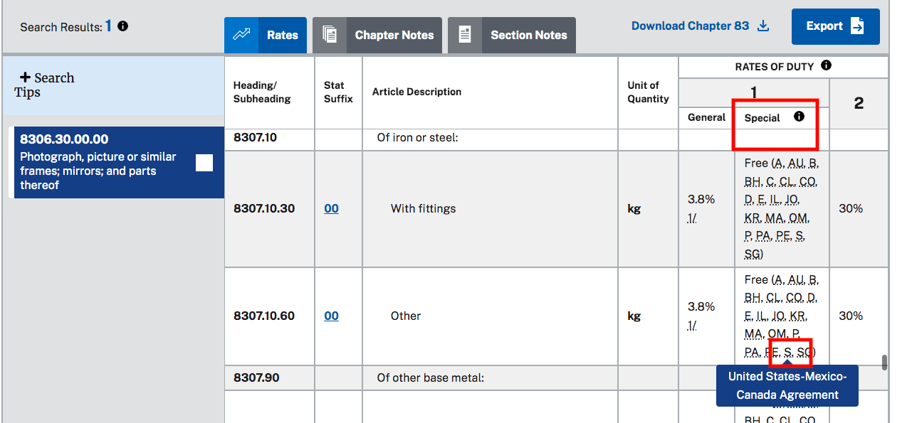 - Si la colonne « Special Duties » indique « S/S+ » OU la colonne « General Duty Rates » indique Gratuit, votre produit pourrait être admissible à la franchise de droits de l'ACEUM.
